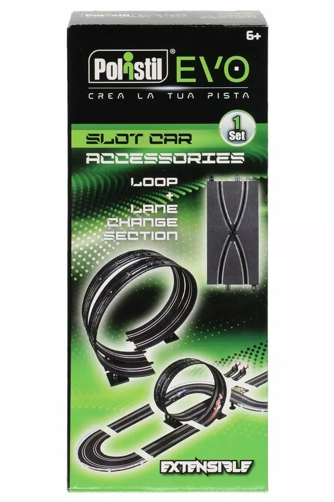 Lisäosa 1:43 Polistil EVO autorataan. Pakkaus sisältää silmukan ja kaistanvaihto palan. Ikäsuositus 6+.