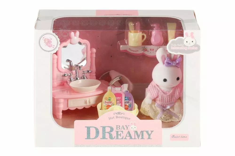 Leikkisetti sisältää suloisen pupuhahmon (n. 9 cm) keltaisessa mekossa, pesualtaan peilillä, hyllyn sekä pieniä tarvikkeita, kuten pulloja ja hoitotuotteita. Hempeät värit ja tarkkaan viimeistellyt yksityiskohdat tekevät tästä setistä täydellisen lisän lasten leikkimaailmaan. Ikäsuositus: 3+ vuotta.
