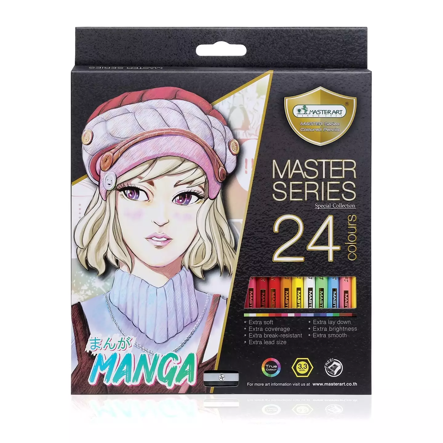 Pakkaus sisältää 24 kpl manga-sävyistä värikynää. Korkealaatuiset puuvärikynät, joissa on täyteläinen ja pehmeä pigmentti sekä hyvä valonkesto. Kirkkaat värit, jotka näkyvät myös tummalla kartongilla. Kuusikulmainen laadukas puinen varsi takaa hyvän otteen sekä värikynien helpon teroittamisen. Paketissa tulee mukana ilmainen teroitin.