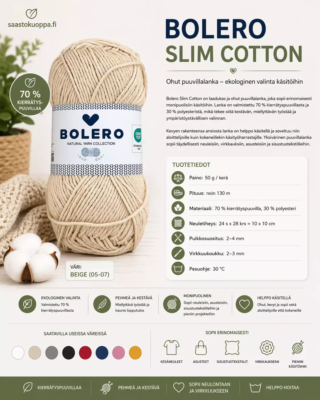 Bolero Slim Cotton on laadukas ja ohut puuvillalanka, joka sopii erinomaisesti monenlaisiin käsitöihin. Lanka on valmistettu 70 % kierrätyspuuvillasta ja 30 % polyesteristä, mikä tekee siitä kestävän, miellyttävän työstää ja ympäristöystävällisen valinnan.Kevyt rakenne tekee langasta helposti käsiteltävän, joten se sopii hyvin sekä aloittelijoille että kokeneille harrastajille. Yksivärinen lanka toimii loistavasti neuleissa, virkkauksessa, asusteissa ja sisustustekstiileissä.Ajaton beige sävy tuo projekteihin luonnollisen ja harmonisen ilmeen.?? TuotetiedotTuotetyyppi: PuuvillalankaMalli: Bolero Slim CottonPaino: 50 g / keräPituus: noin 130 mMateriaali: 70 % kierrätyspuuvilla, 30 % polyesteriNeuletiheys: 24 s × 28 krs = 10 × 10 cmPuikkosuositus: 2–4 mmVirkkuukoukku: 2–3 mmPesuohje: 30 °CVäri: Beige (05-07)?? KäyttökohteetNeuleetVirkkausprojektitAsusteetSisustustekstiilitPienet käsityöt?? Pakkaus sisältää1 × lankakerä?? SEO-avainsanatpuuvillalanka, beige lanka, kierrätyspuuvilla lanka, bolero slim cotton, ohut puuvillalanka, virkkauslanka, neulelanka, ekologinen lanka