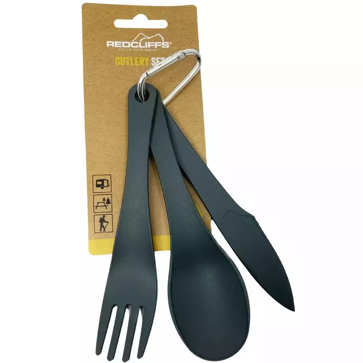 Kevyet retkiaterimet voidaan kiinnittää renkaan avulla rinkkaan tai nostaa kuivumaan huuhtelun jälkeen. Muovista valmistetut haarukka, lusikka ja veitsi.