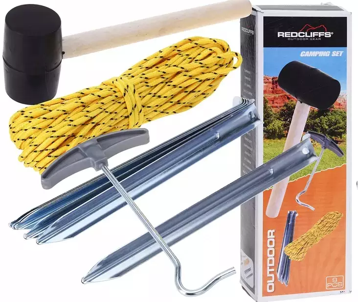 kätevä 9-osainen setti teltankiinnitykseen - setissä mukana: 6 telttakeppiä, vasara keppien kiinnitykseen, kiinnityskoukku sekä telttanarua - setin paino 0,6 kg - pakkauksen mitat: 295x98x60 mm... Lue lisää