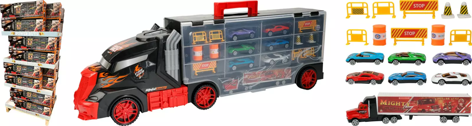 Monipuolinen ja näyttävä autonkuljetusrekka, joka tarjoaa tuntikausia vauhdikasta leikkiä. Suuri rekka toimii samalla säilytysboksina, jonka läpinäkyvissä lokeroissa on mukana useita pikkuautoja sekä liikenneaiheisia lisävarusteita, kuten esteitä ja liikennemerkkejä.Leikkisetti innostaa lasta keksimään omia liikenne- ja pelastustehtäviä sekä kehittää mielikuvitusta ja hienomotoriikkaa. Kätevä kantokahva tekee setistä helpon ottaa mukaan.