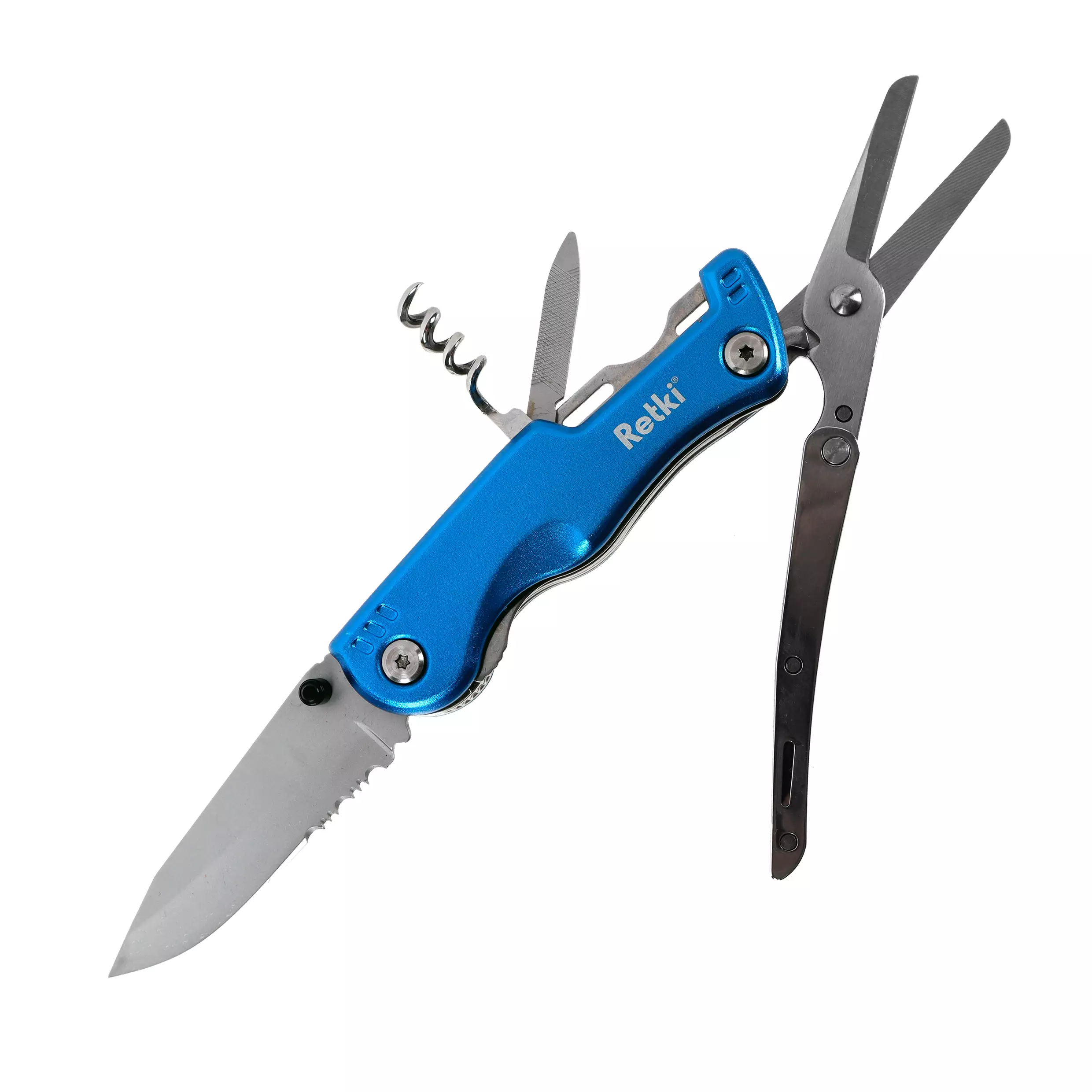 Ruostumattomasta teräksestä ja alumiinista valmistettu moderni linkkuveitsi. Sisältää puukon, kunnon sakset, viilan sekä korkkiruuvin.