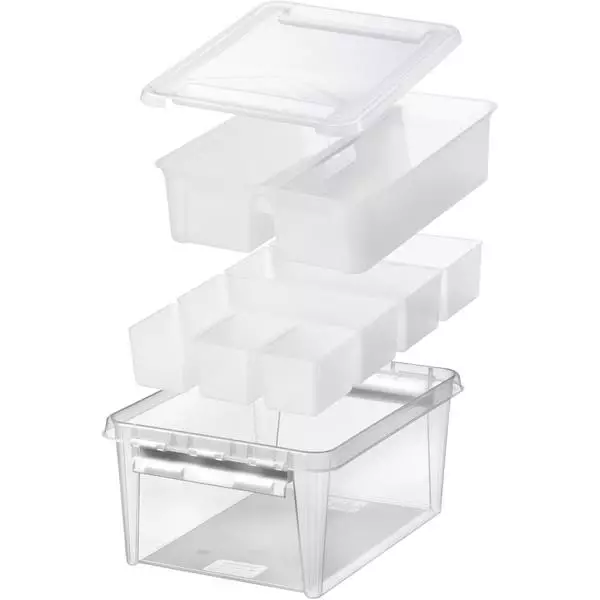 SmartStore™ Classic -valikoima sisältää laajan valikoiman laadukkaita säilytyslaatikoita erilaisiin tarpeisiin. SmartStore™ Classic on suosituin valikoimamme ja on ollut olemassa vuodesta 1995 lähtien, tarjoten turvallisen ja kestävän säilytyksen. Tämä suosittu, keskikokoinen laatikko monipuoliseen kotitalouksien säilytykseen sisältää seitsemän lisäosaa. Ihanteellinen työkalupakkina, sillä insertit sopivat täydellisesti pienten esineiden järjestämiseen ja helposti saavutettavissa. Säilytyslaatikko on pinottavissa kannen ollessa kiinni, ja vahvat klipsit varmistavat tiukan kannen sulkemisen. Valmistettu Ruotsissa, kestävästä elintarvikeluokan muovista.