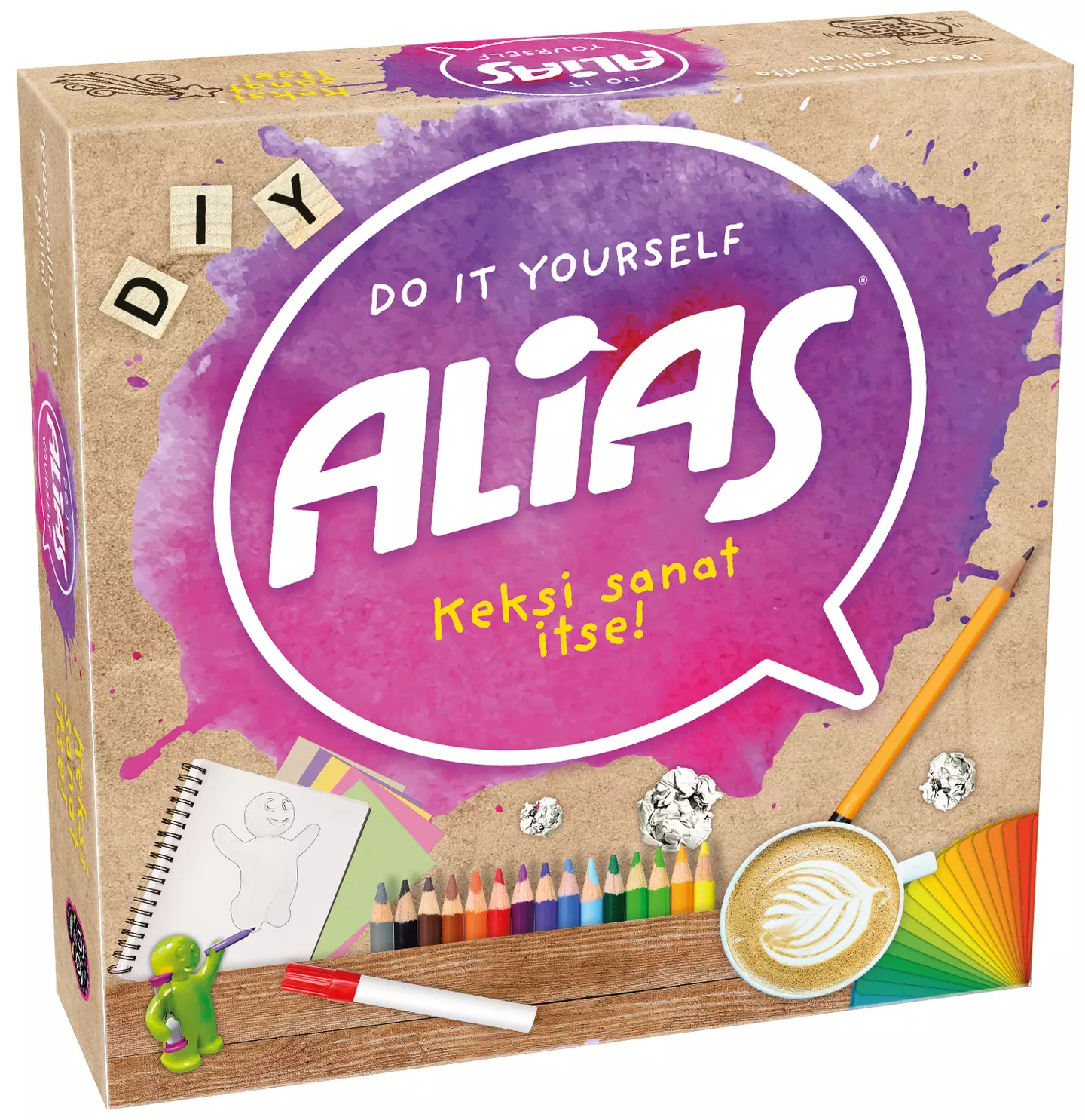 Luo itse oma ainutlaatuinen Alias! DIY Aliaksessa pelaajat keksivät sanoja korteissa olevien otsikoiden perusteella. Kun olet kirjoittanut sanan, selitä se ja anna muiden arvata! Ensimmäisenä maaliin päässyt pelaaja voittaa! Hauska ja luova peli, joka on omistajansa näköinen! Kaksipuolisen pelilaudan ansiosta pelin kestoon voi vaikuttaa. Kun kortit ovat täynnä, jatka pelaamista perinteisillä Alias-säännöillä! Pelaajien määrä: 4+. Ikäsuositus: 8+ v. Pelin kesto: 30+ min.