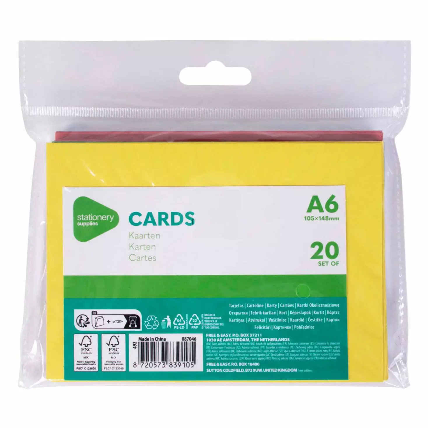 20 värillisen kortin setti, A6-koko (10,5 x 14,8 cm). Sisältää värit: sininen, keltainen, punainen, oranssi ja vihreä.