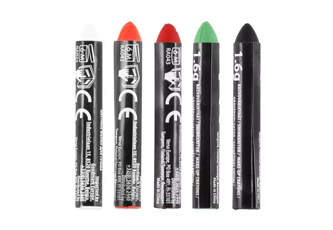 Turvaliset kasvovärit virpojalle. Pakkaus sisältää värit: musta, valkoinen, punainen, oranssi ja vihreä.